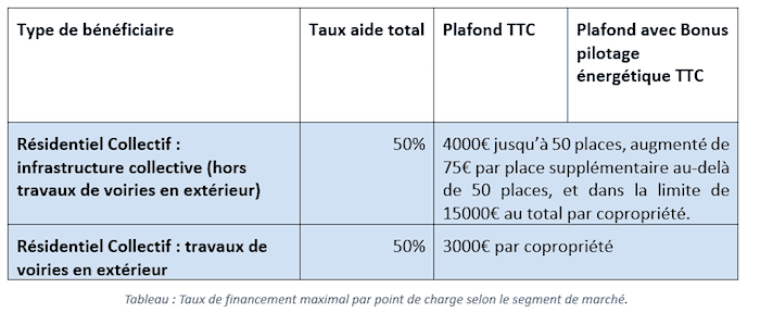 La prime ADVENIR « 3 000 copropriétés » est limitée à 50% du coût de l’infrastructure collective, hors installation des bornes de recharge.