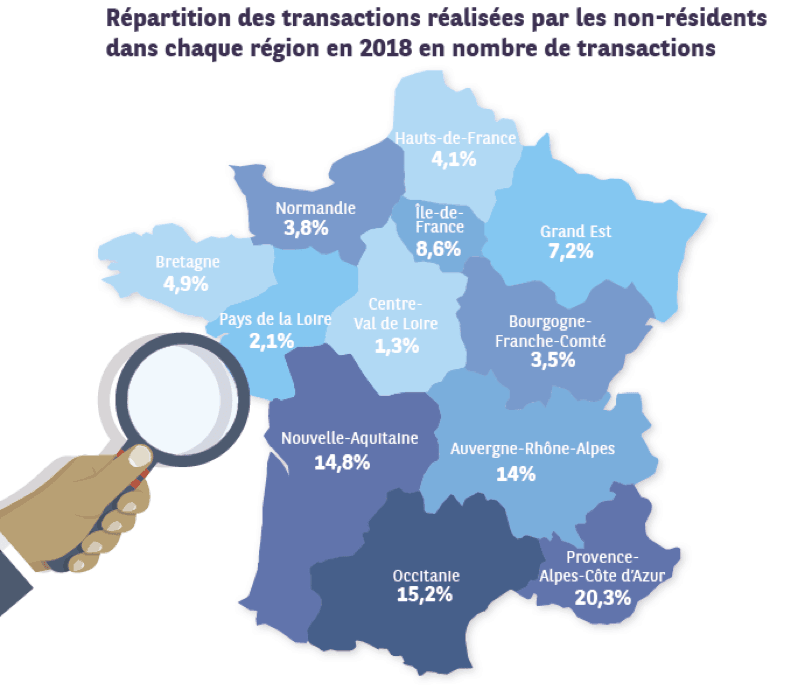 Le marché des acquéreurs étrangers de biens immobiliers en France a encore progressé en 2018 (+6%), notamment pour les étrangers résidents. Malgré le Brexit, les Britanniques restent les principaux acquéreurs. La Région PACA conserve la tête du classement avec 20% des transactions réalisées.